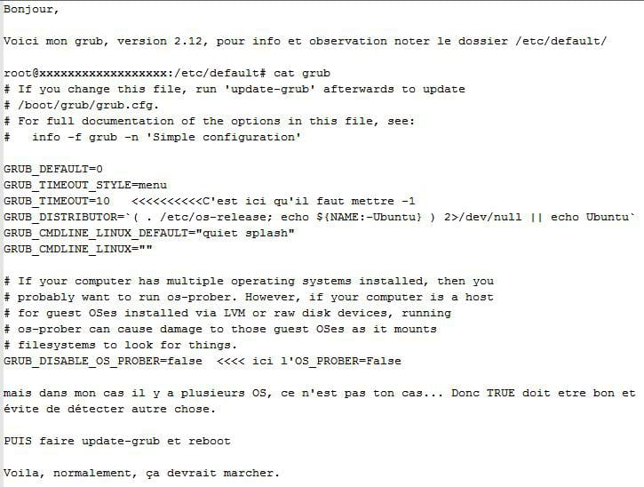 J'ai réessayé j'ai mis -1 et fait le update mais sa reste toujours le grub au démarrage, quand je démarre le pc il n'y a aucun compte a rebours et je dois forcément cliquer sur entrer, c'est embêtant.