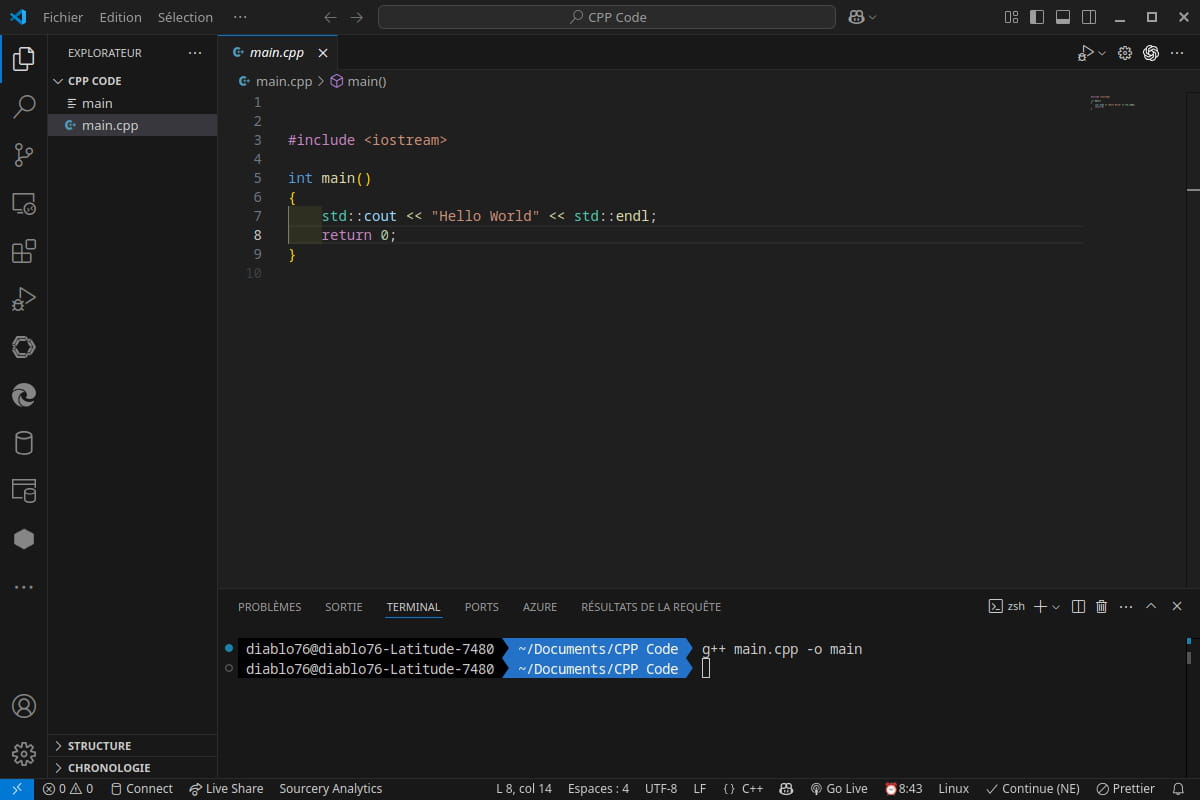 Dans mon terminal, je me rends dans le dossier où se trouve main.cpp à l'aide de la commande cd, puis j'entre la commande donné dans les forum que j'ai lue :